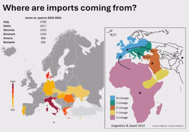 According to 2024 National Bee Unit (NBU) data, most imported queens come from southern Europe, particularly: