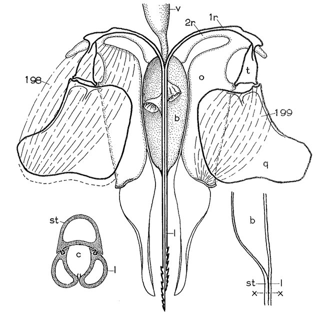 The shaft of the sting is made of three interlocking parts: the two barbed lancets and a central dorsal stylet. Together, they form a canal through which venom flows. At the base, the structure enlarges into a bulb containing venom, aided by tiny umbrella valves that pump the liquid forward. The venom sac and associated glands connect to this bulb, supplying the sting during use.
